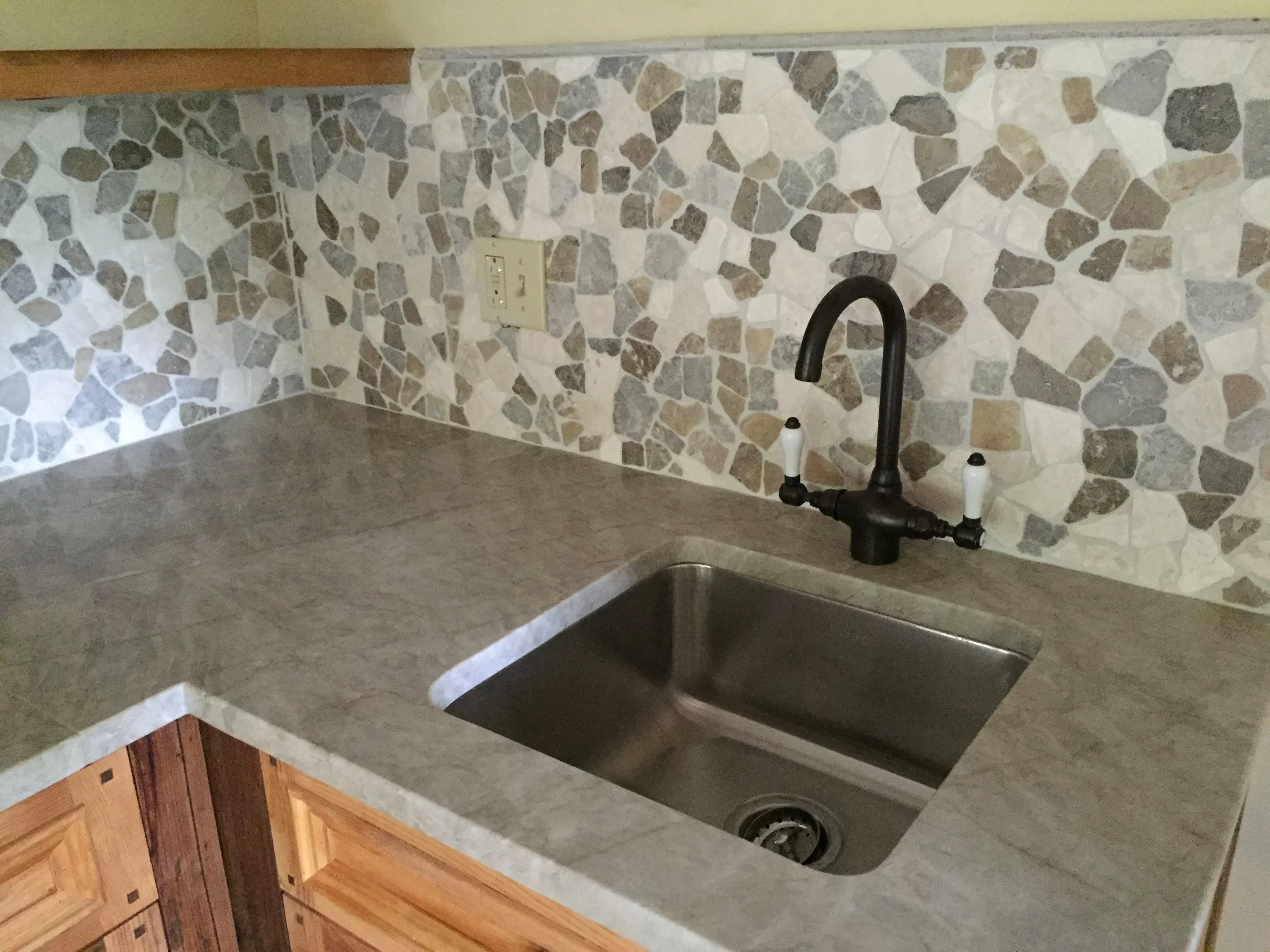 This stone mosaic tile works well with the Taj Mahal countertops.