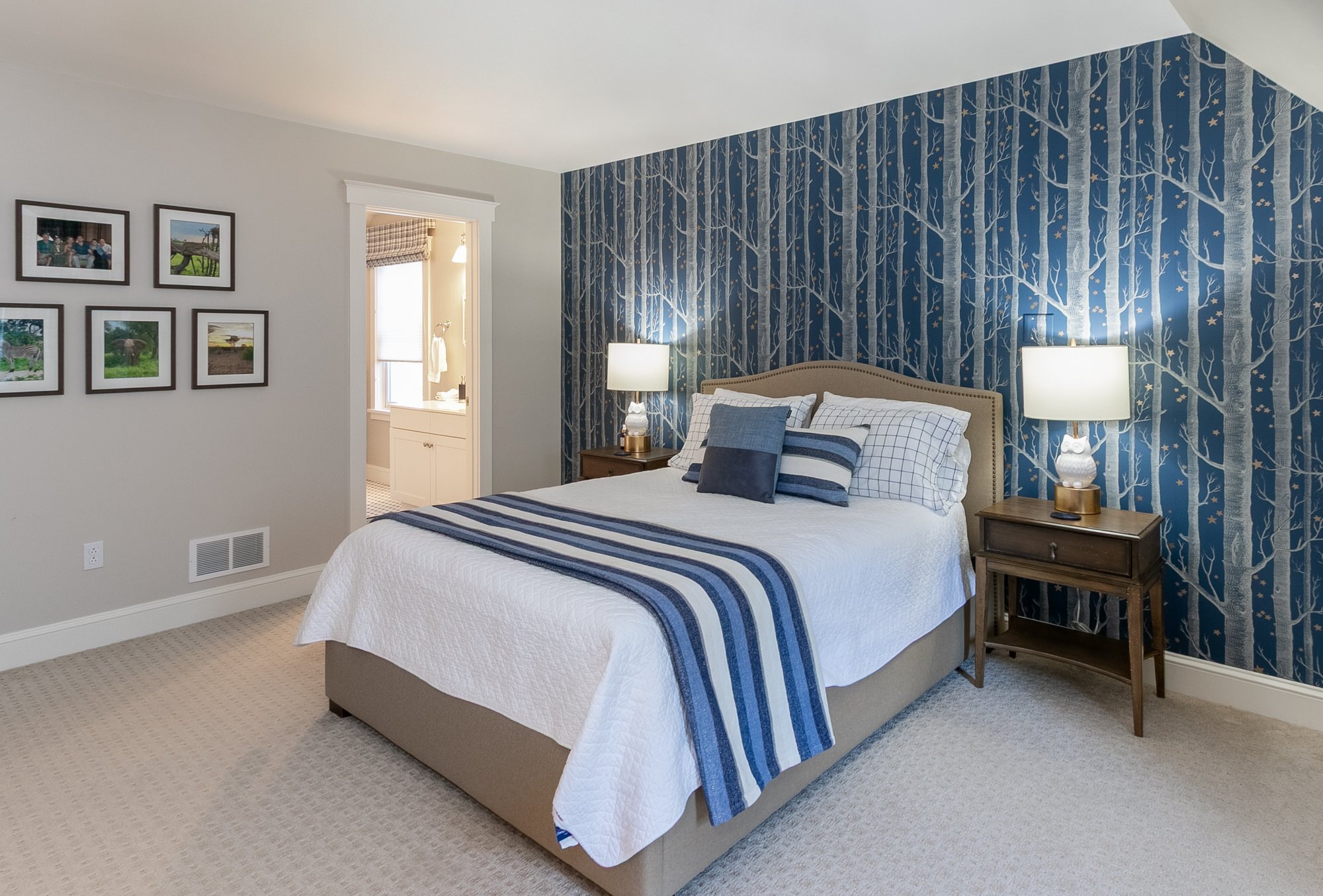 The interiors are bright and playful with moments of whimsy throughout the house. A guest bath features lively fish wallpaper, while a woodland star pattern transforms one of the guest bedrooms. In the bunk room, a soft tree-ring wallpaper adds texture and warmth, and even the laundry room gets its own moment with a charming bicycle print.
