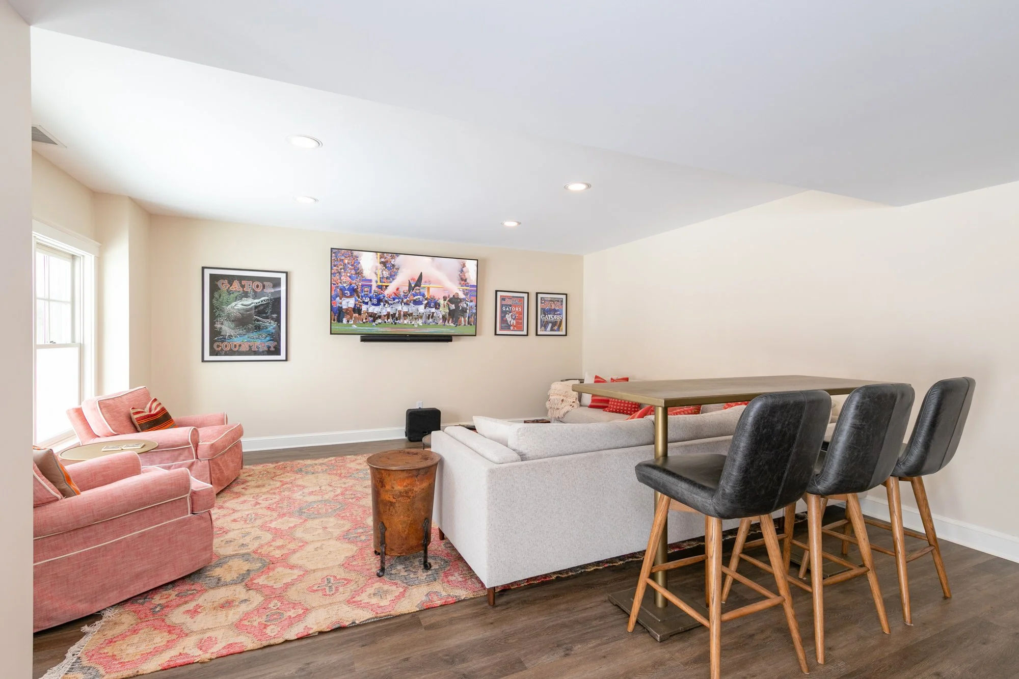 Downstairs, the basement was designed for serious game-time energy. The family are devoted Florida Gators fans, so naturally the space includes a custom Gator-blue Big Chill retro refrigerator and plenty of room for gathering around the TV on game day.