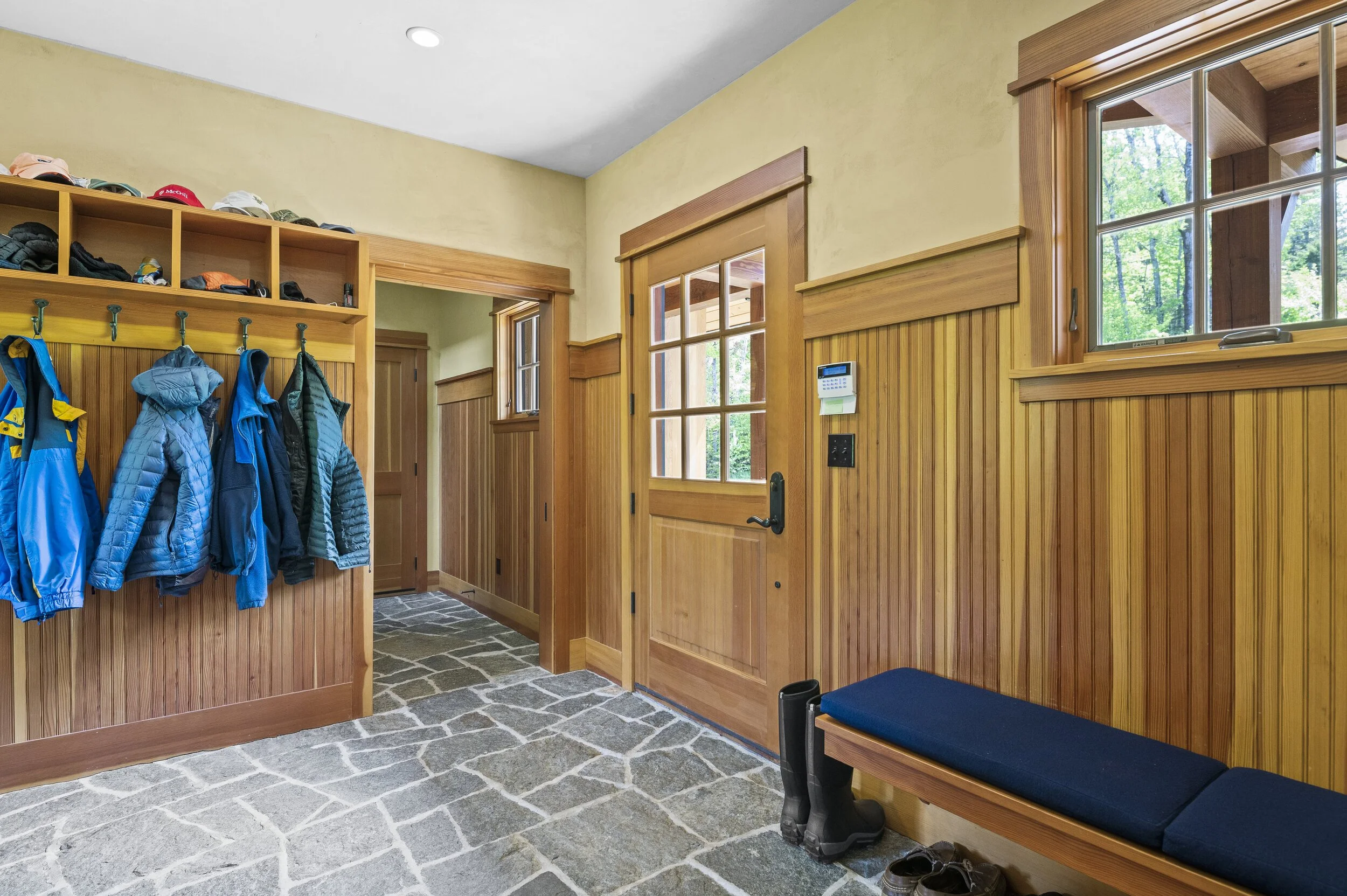A vacation home surrounded by beautiful mountain views. We worked closely with the builder and the homeowner to make this a spectacular year round vacation home. Cathedral ceilings in the living room allow for a two-story stone fireplace with expansive full-height sliding doors out to the back deck where views of the green mountains are revealed.
